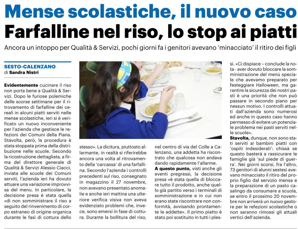 Nuova bufera su Qualità & Servizi, l’azienda che si occupa di refezione scolastica di proprietà dei Comuni di Sesto Fiorentino, Campi Bisenzio, Signa, Calenzano, Carmignano, Barberino di Mugello e Capannori. Come riporta, infatti, La Nazione sull’edizione di sabato 1° novembre 2025 (screenshot in basso) sono state trovate delle farfalline all’interno del riso, motivo per il quale il pasto non è stato somministrato nelle mense scolastiche.