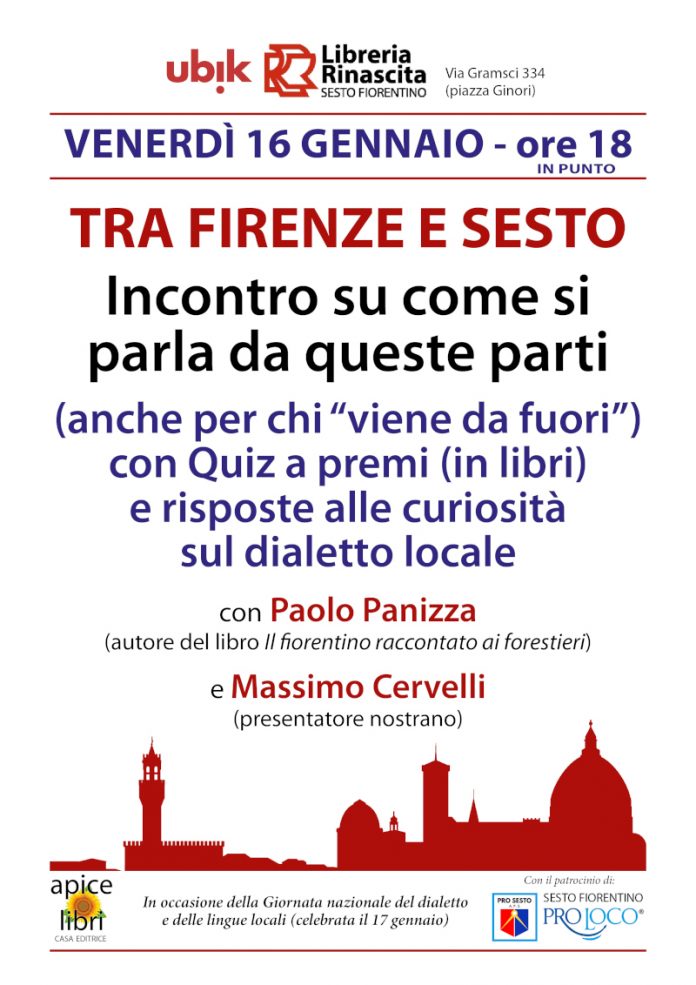 Di questo si parlerà venerdì 16 gennaio presso la Libreria Rinascita di Sesto Fiorentino, alle ore 18 in punto, insieme a Paolo Panizza (autore dell’ormai classico “Il fiorentino raccontato ai forestieri”) e Massimo Cervelli, con quiz a premi in libri per il pubblico, offerti dalla casa editrice «apice libri» di Stefano Rolle.