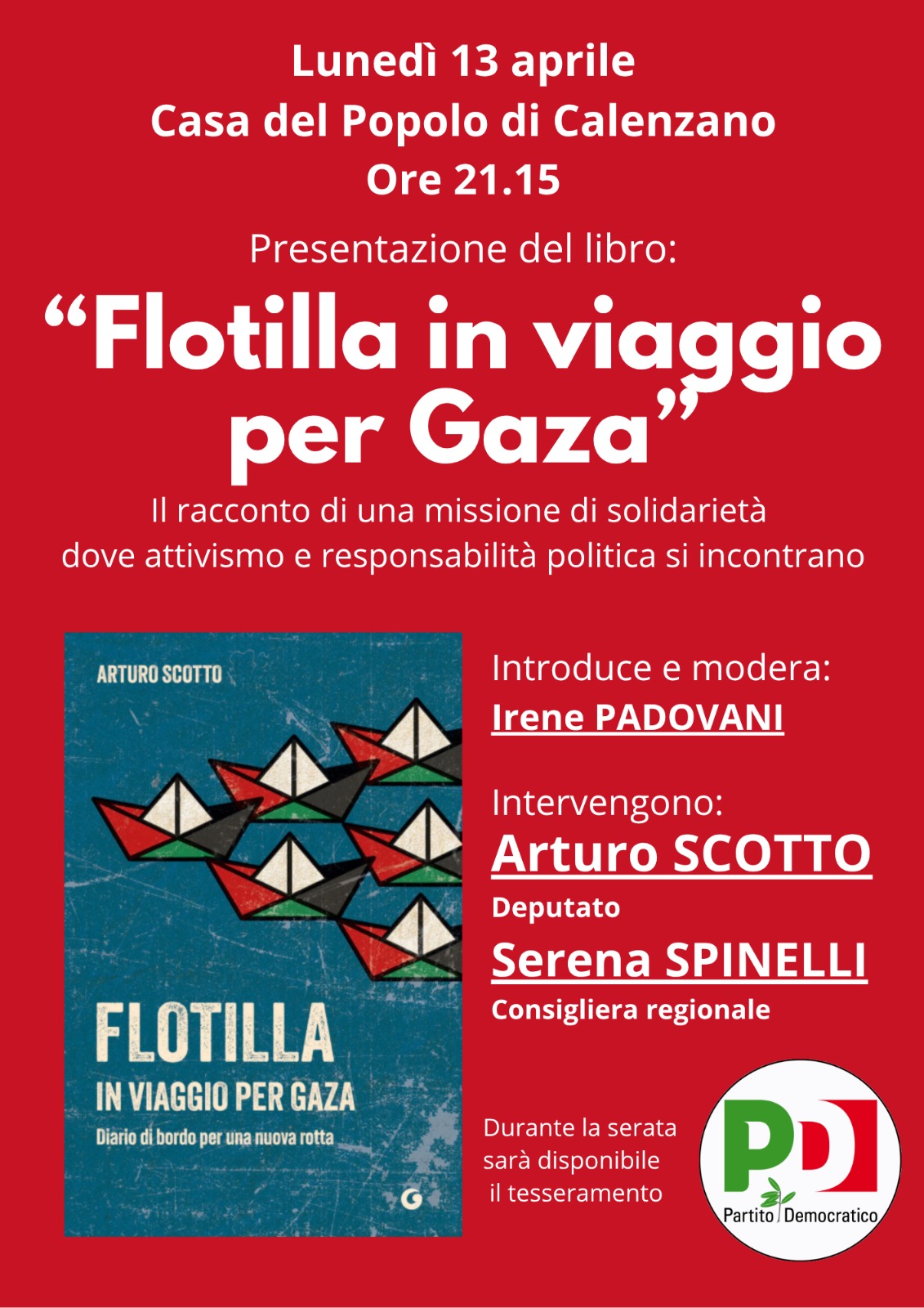 Il Partito Democratico di Calenzano organizza un’iniziativa pubblica in programma lunedì 13 aprile 2026 alle ore 21.15 presso la Casa del Popolo di Calenzano (via G. Puccini 79), dedicata alla presentazione del libro “Flotilla in viaggio per Gaza” di Arturo Scotto.
