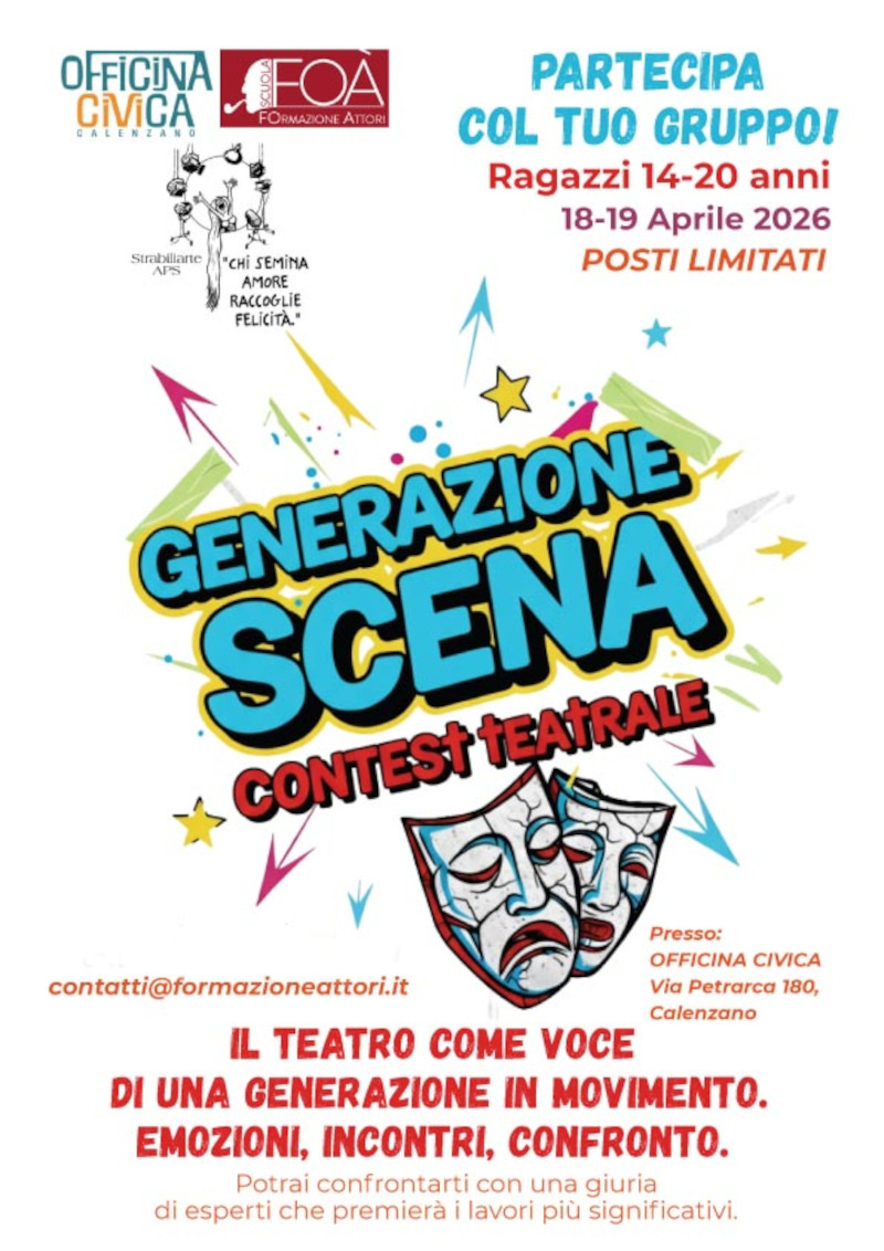 Sabato 18 e domenica 19 aprile, Officina Civica (via Petrarca 180, Calenzano) diventerà il cuore pulsante del teatro giovane con la prima edizione di Generazione Scena. L’evento, nato dalla collaborazione tra FOA’ Formazione Attori e Strabiliarte APS, è un contest unico nel suo genere, pensato specificamente per gruppi teatrali composti da ragazzi di età compresa tra i 14 e i 20 anni.