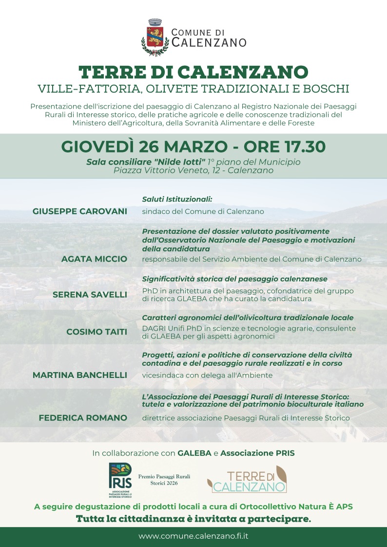 Nell’occasione sarà presentata l‘iscrizione del paesaggio “Terre di Calenzano: ville fattoria, olivete tradizionali e boschi” al Registro Nazionale dei Paesaggi Rurali di interesse storico, delle pratiche agricole.