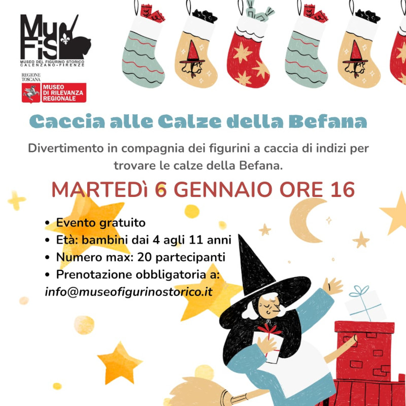 Sarà la Caccia alle Calze della Befana a concludere le iniziative natalizie martedì 6 gennaio 2026 ore 17 sempre presso il MuFiS (evento gratuito max 20 iscritti dai 4 agli 11 anni).