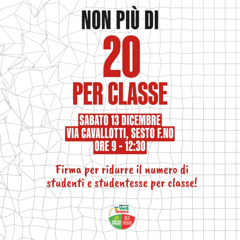 Per questa ragione, Alleanza Verdi Sinistra, in vista del dibattito sulla legge di bilancio e avendo raccolto le opinioni di molte personalità e organizzazioni del mondo della scuola, intende raccogliere le firme per modificare le norme sulla composizione delle classi e sul dimensionamento degli istituti, utilizzando a tal fine 500 milioni di euro che altrimenti verrebbero trasferiti alle scuole private. Proponiamo quindi che le classi siano formate con un numero di studenti non inferiore a 14 e non superiore a 20, riducendo questa soglia a 18 nel caso della presenza di uno studente con disabilità e a 15 nel caso in cui gli studenti con disabilità siano più di uno.