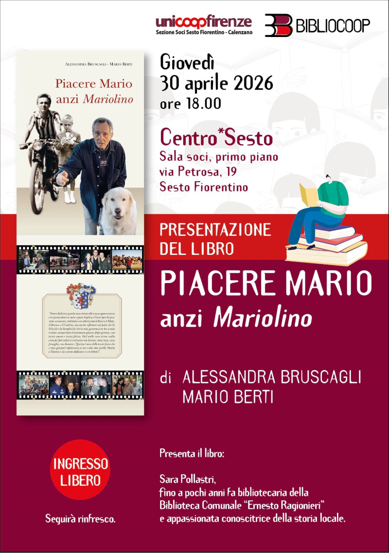 Eventi “Piacere Mario, anzi Mariolino” presentazione del libro di Mario Berti e Alessandra Bruscagli 20 Aprile 2026 0 2 Si terrà giovedì 30 aprile presso la sala soci Coop del Centro Sesto la presentazione del libro Piacere Mario anzi Mariolino scritto da Mario Berti e da Alessandra Bruscagli. Il libro sarà presentato da Sara Pollastri.