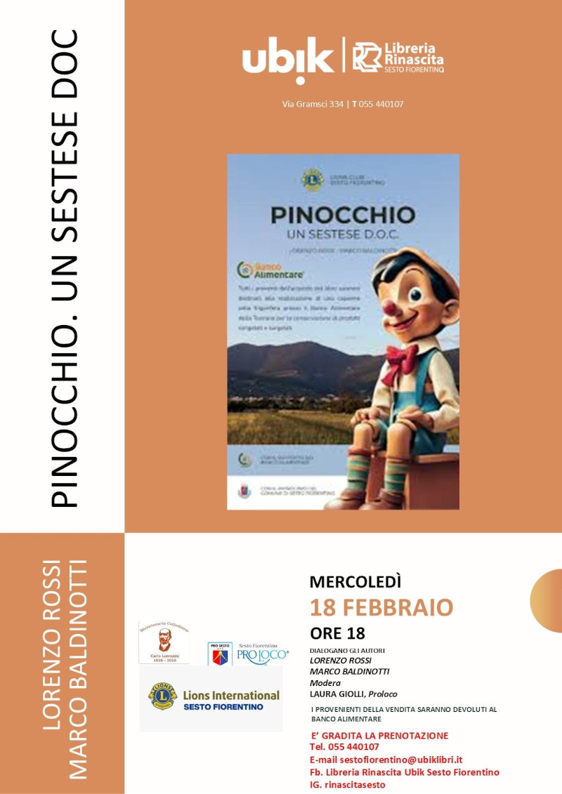 Sara presentato mercoledì 18 febbraioPinocchio un sestese D.O.C.”, il libro di Lorenzo Rossi e Marco Baldinotti realizzato dal Lions Club Sesto Fiorentino. L’appuntamento, moderato dalla presidente della Pro Loco Laura Giolli, è per le ore 18 alla libreria Rinascita in via A. Gramsci 334 a Sesto Fiorentino. E’ gradita la prenotazione chiamando il numero 055440107 o inviando una mail all’indirizzo [email protected].