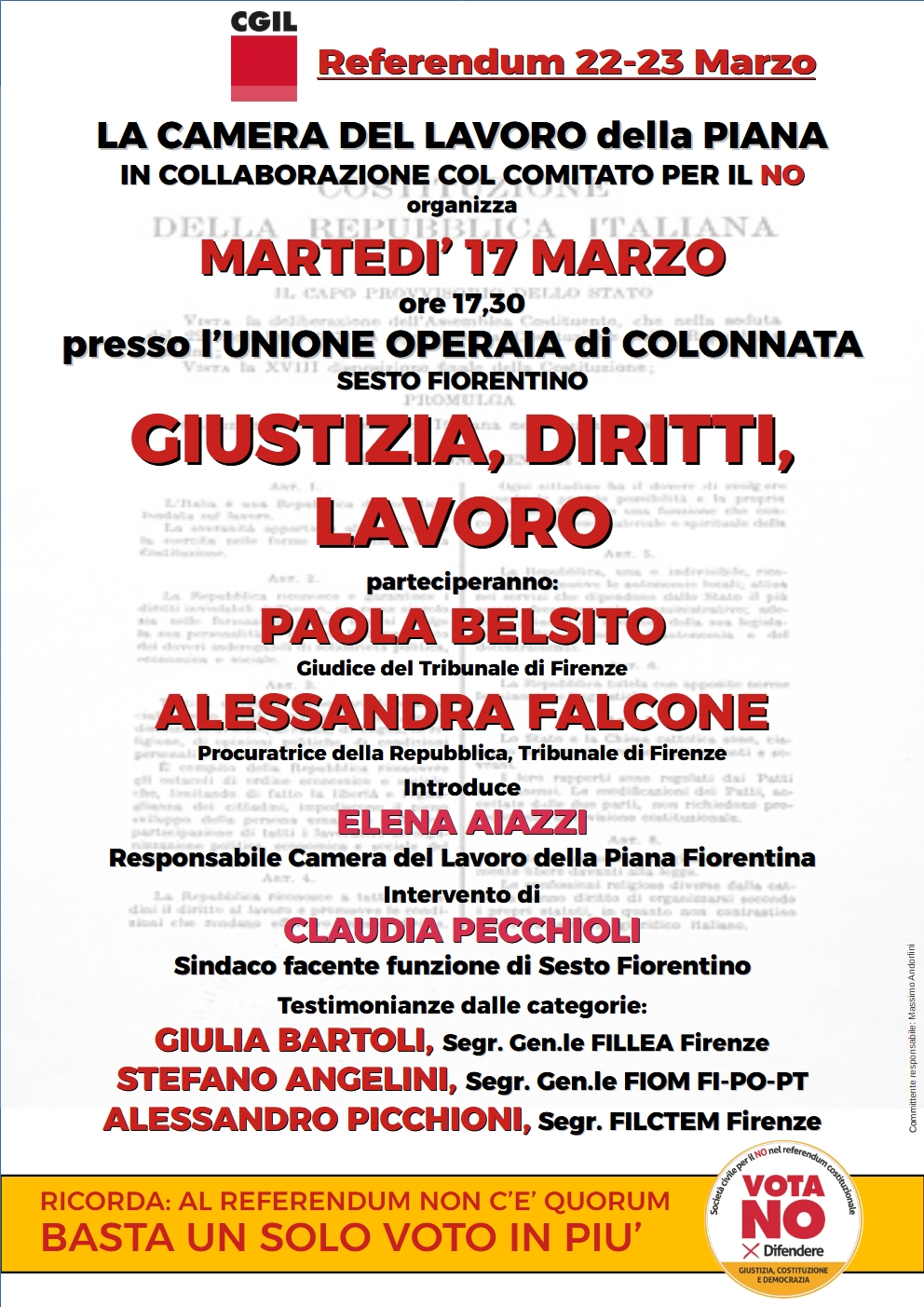 In vista del referendum sulla giustizia in programma domenica 22 e lunedì 23 marzo, la Camera del Lavoro della Piana, in collaborazione col comitato per il “NO”, organizza per martedì 17 marzo l’incontro dal titolo “Giustizia, diritti, lavoro“. L’appuntamento è alle ore 17.30 all’Unione Operaia di Colonnata in piazza M. Rapisardi a Sesto Fiorentino.
