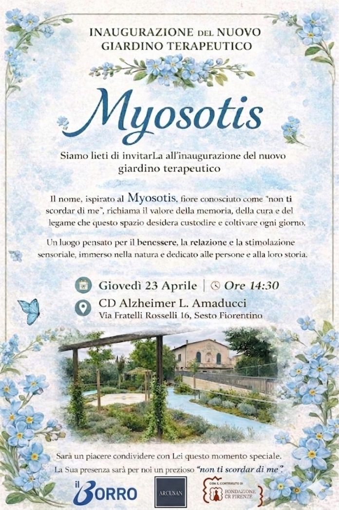 SESTO FIORENTINO – Un nuovo spazio dedicato alla cura e al benessere delle persone con demenza prende vita al Centro Diurno Alzheimer “Amaducci”. La Cooperativa Sociale Il Borro ha, infatti, realizzato il giardino terapeutico “Myosotis” pensato per la stimolazione cognitiva e sensoriale di utenti in fase avanzata di malattia, con il sostegno della Fondazione Cassa di Risparmio di Firenze e in partenariato con l’Associazione Arcusan.