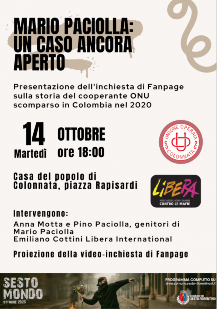 Per questa edizione di SestoMondo, LIBERA racconta la storia di Mario Paciolla, insieme ai genitori, Anna Motta e Pino Paciolla, Emiliano Cottini di Libera Internazionale e la proiezione dell’inchiesta di Fanpage.it.